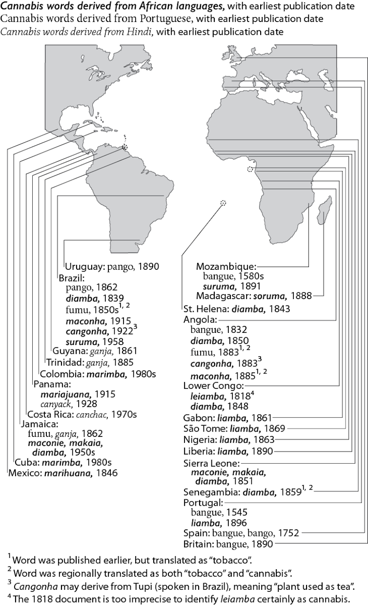 As pessoas que transportaram sementes moldaram a nossa linguagem moderna. Em todo o Atlântico, muitos termos para cannabis remontam à África Central, incluindo a palavra global marijuana, derivada de Kimbundu mariamba .